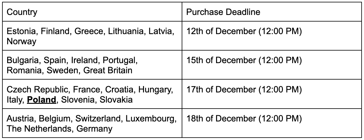 Sprawdź poniższe terminy składania zamówień i złóż zamówienie na czas, aby Twoje paczki dotarły przed Wigilią Bożego Narodzenia.